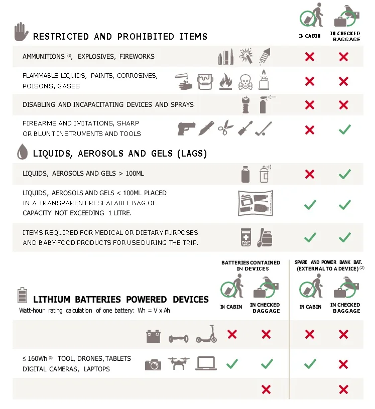 - Safety matches (one small packet) or cigarette lighter (one per person) that does not contain unabsorbed liquid fuel, other than liquefied gas;